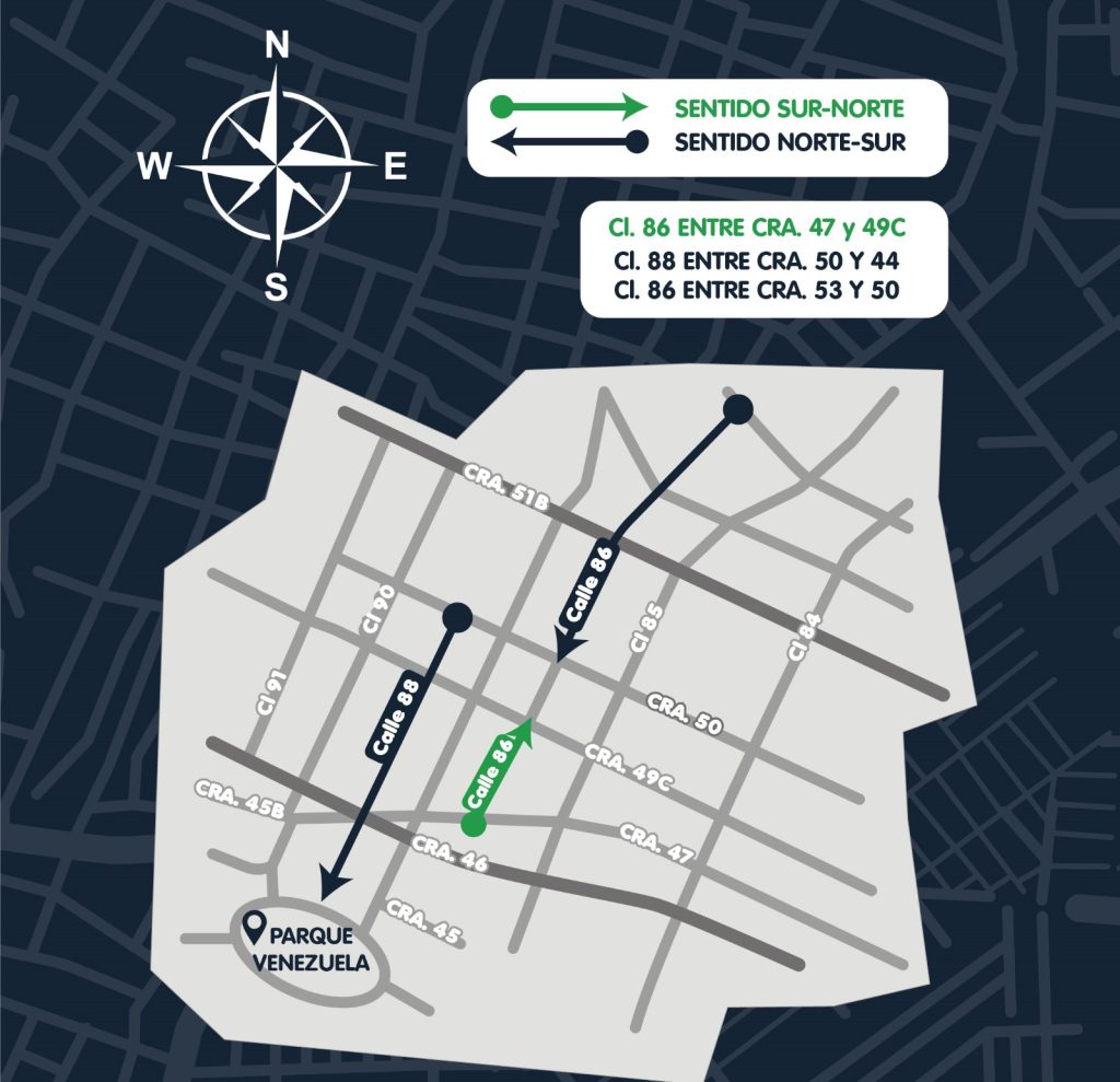 Calle 88 entre carreras 50 y 44 (parque Venezuela) cambia de único sentido vial sur-norte a único sentido de circulación vial norte – sur.
