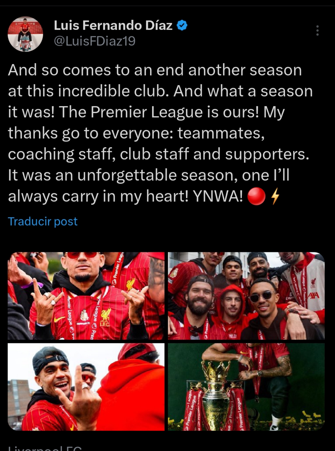 Luis Díaz se despide del Liverpool tras conquistar la Premier League