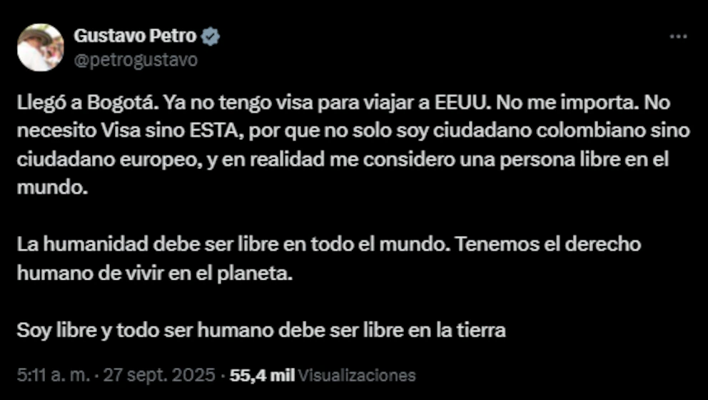 “Llegó a Bogotá. Ya no tengo visa para viajar a EE. UU. No me importa. No necesito visa, sino ESTA, porque no solo soy ciudadano colombiano sino europeo, y en realidad me considero una persona libre en el mundo”, escribió.