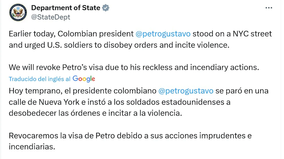 El hecho ocurrió luego de la participación del mandatario en una manifestación en Times Square, Nueva York, donde instó a soldados estadounidenses a desobedecer órdenes del entonces presidente Donald Trump relacionadas con la guerra en Gaza. Las autoridades norteamericanas consideraron estas declaraciones como un llamado a la insubordinación y las calificaron de “imprudentes e incendiarias”.