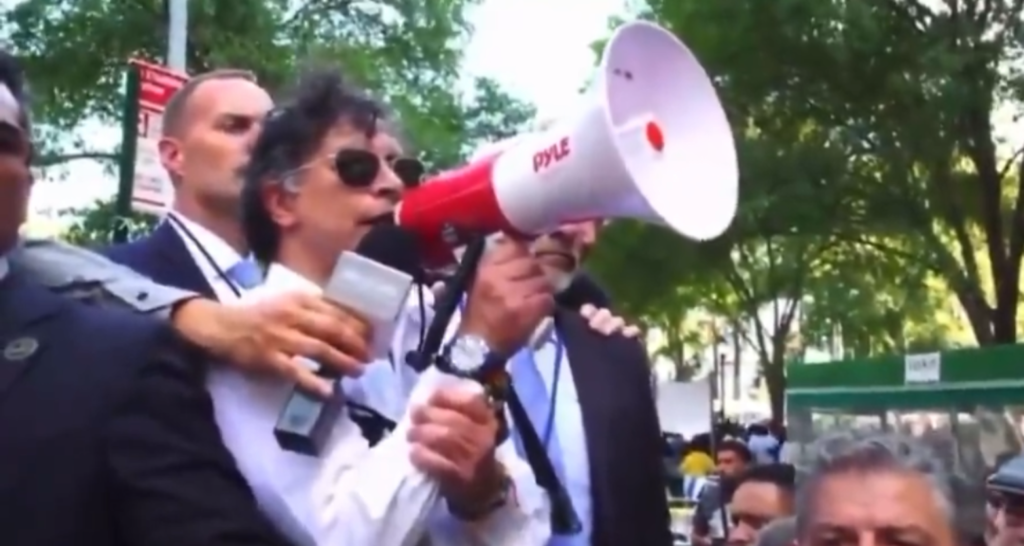 En la protesta, que reunió a unas 2.000 personas y fue convocada en rechazo a la visita del primer ministro israelí, Benjamín Netanyahu, a la Asamblea General de la ONU, Petro apareció vestido con una guayabera blanca, acompañado por la delegación colombiana y agitando banderas nacionales en apoyo al pueblo palestino.
