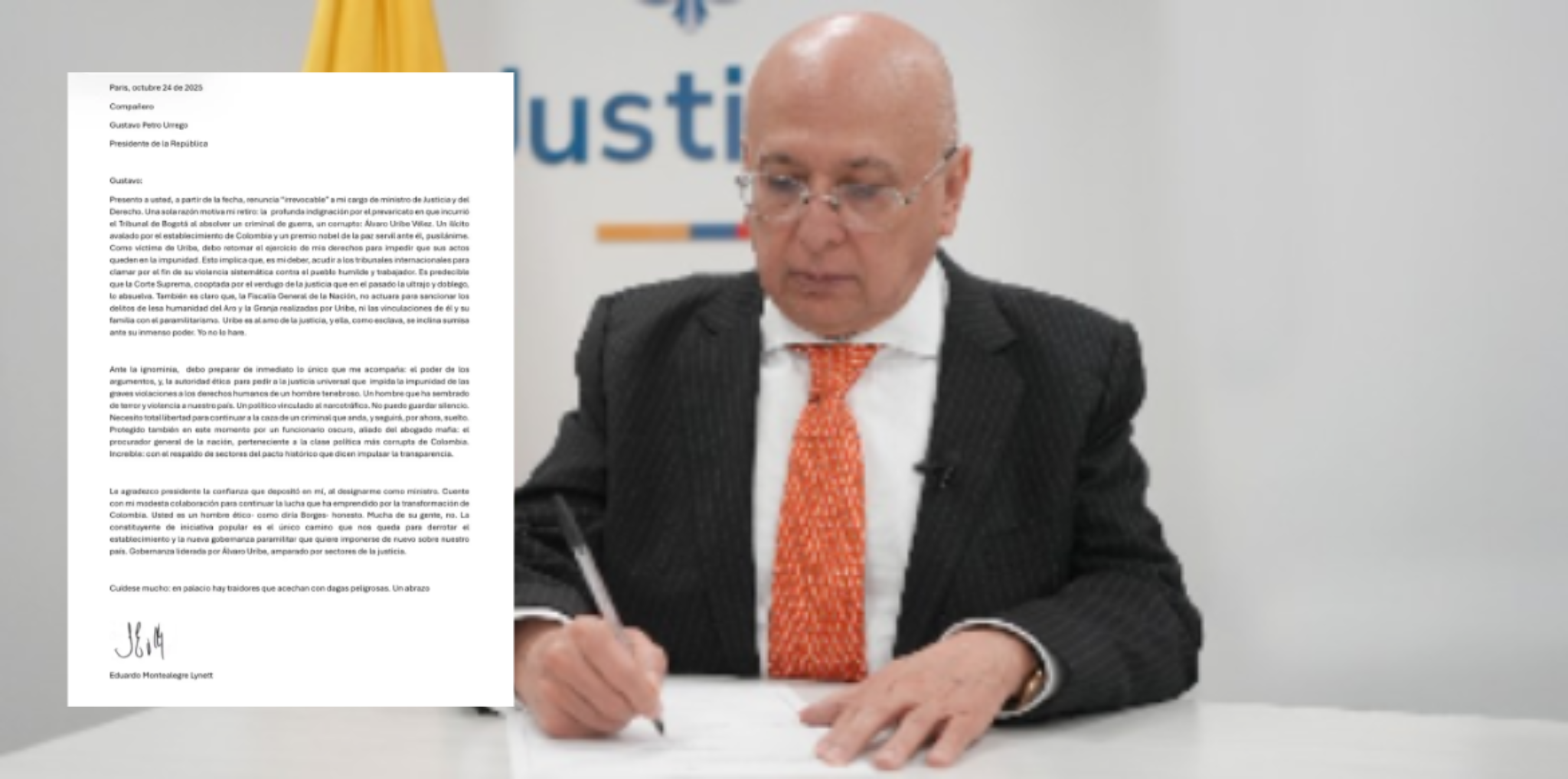 El ministro de Justicia, Eduardo Montealegre, presentó su renuncia al cargo en el gabinete del presidente Gustavo Petro. La decisión se conoció en medio de un ambiente de tensión institucional, luego de varios desencuentros entre el ministro y el procurador general, Gregorio Eljach.