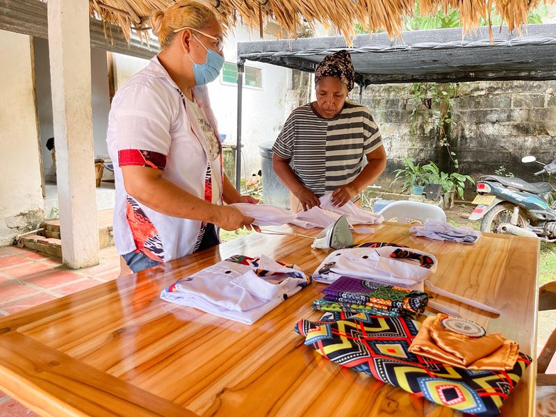“En septiembre recibimos una dotación de telas blancas con las que empezamos a elaborar productos para recaudar fondos. Somos 15 mujeres beneficiadas y desde entonces confeccionamos camisas con identidad afro, diseños sublimados y prendas para instituciones, hoteles, turismo y colegios”, cuenta Katiusca con orgullo.